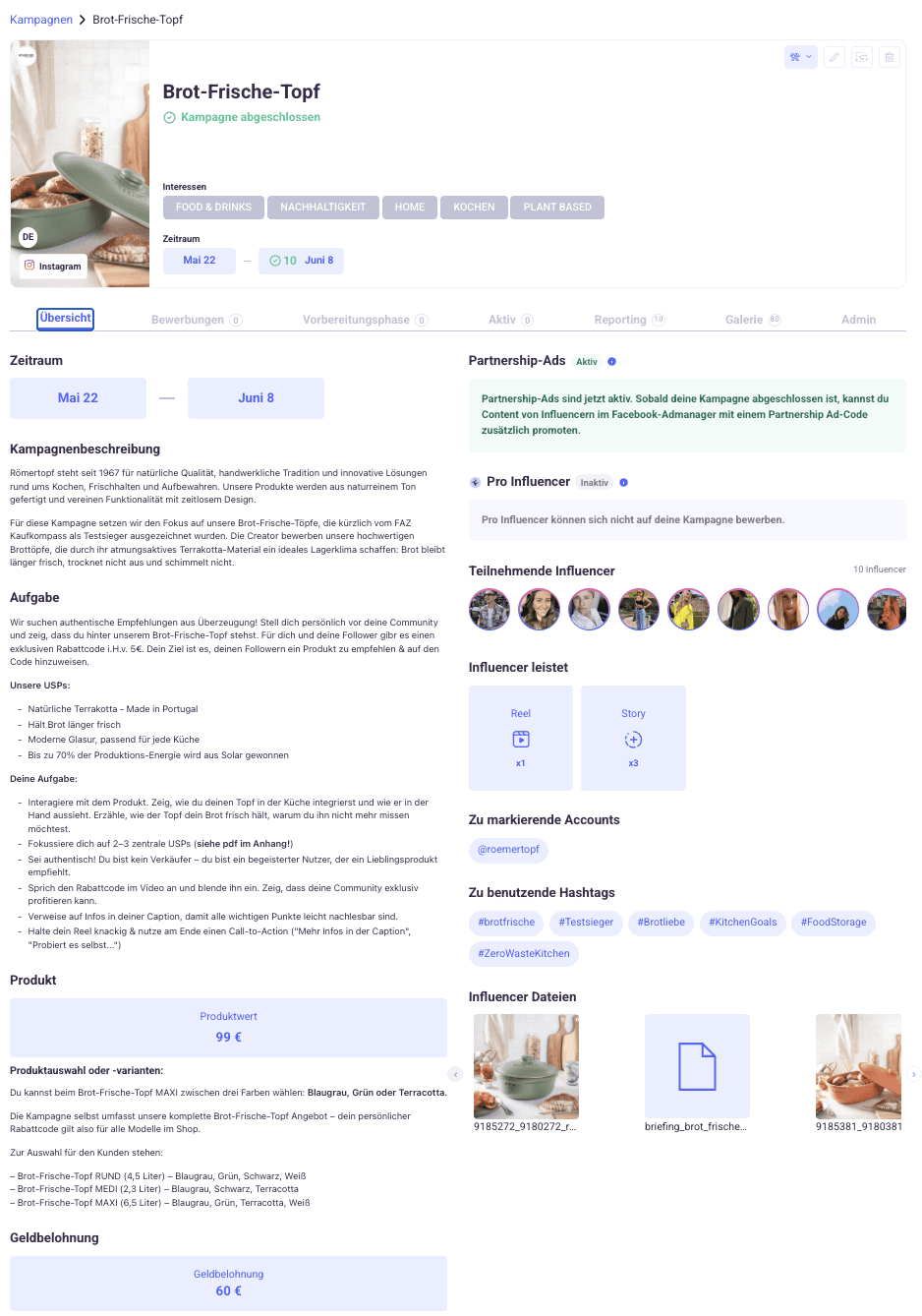Ziel der Kampagne war es, den nachhaltigen Brot-Frische-Topf durch authentische Empfehlungen von Micro-Influencer sichtbar zu machen. Innerhalb von zwei Wochen entstanden mit nur 10 ausgewählten Creatorn 32 Content-Pieces, darunter Reels und Stories direkt aus ihren Küchen. Besonders ein Reel stach hervor: Es ging viral, erzielte überdurchschnittliche Engagement-Werte und generierte allein einen Großteil der 212.000 organischen Post-Reichweite.